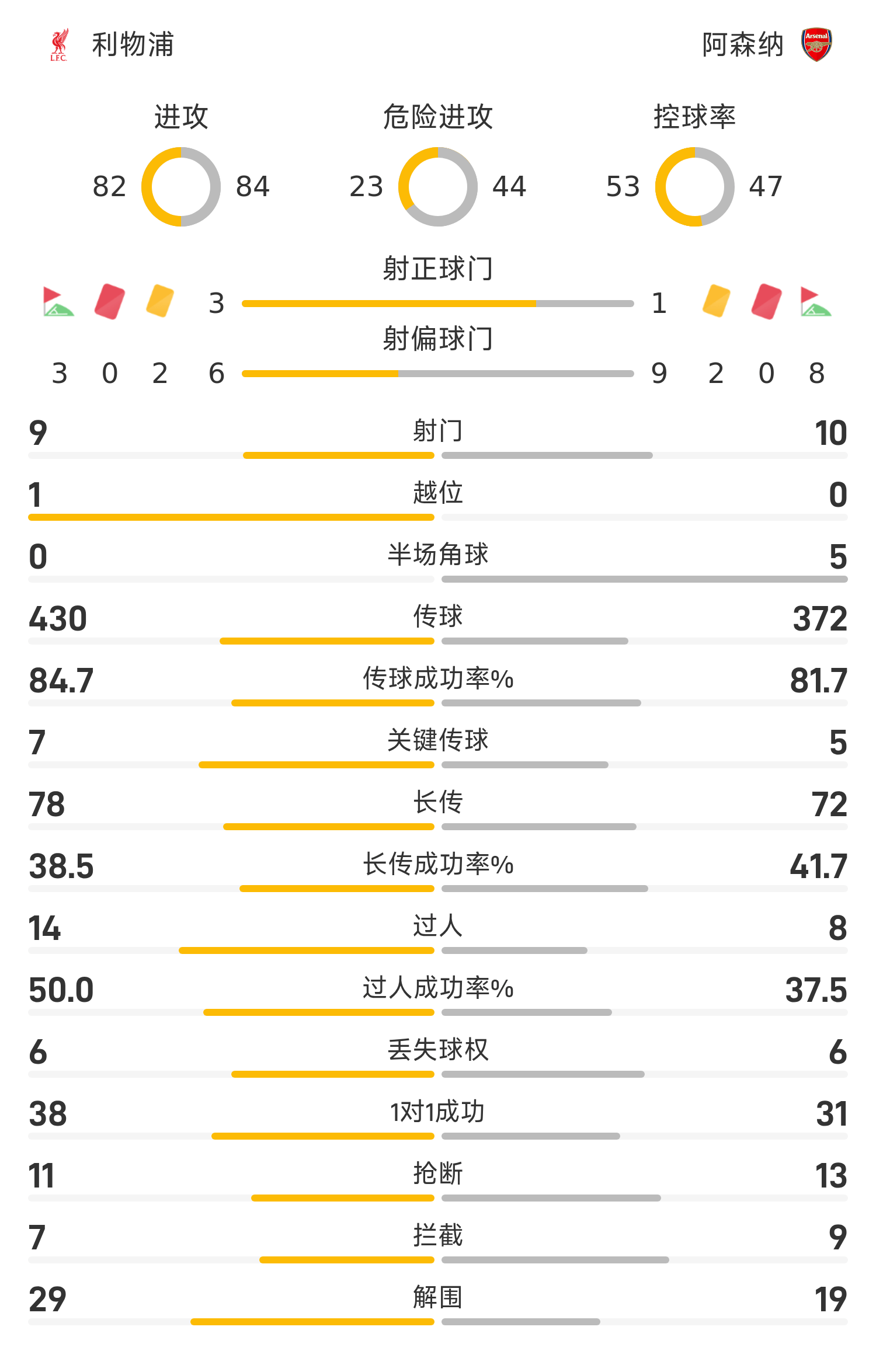 这场比赛里,阿森纳在射门方面以10-9的微弱优势领先;但射正方面,利物浦以3-1占据优势。在控球率方面,利物浦以53%-47%保持着优势;但在危险进攻方面,阿森纳则以44-23明显高于红军。